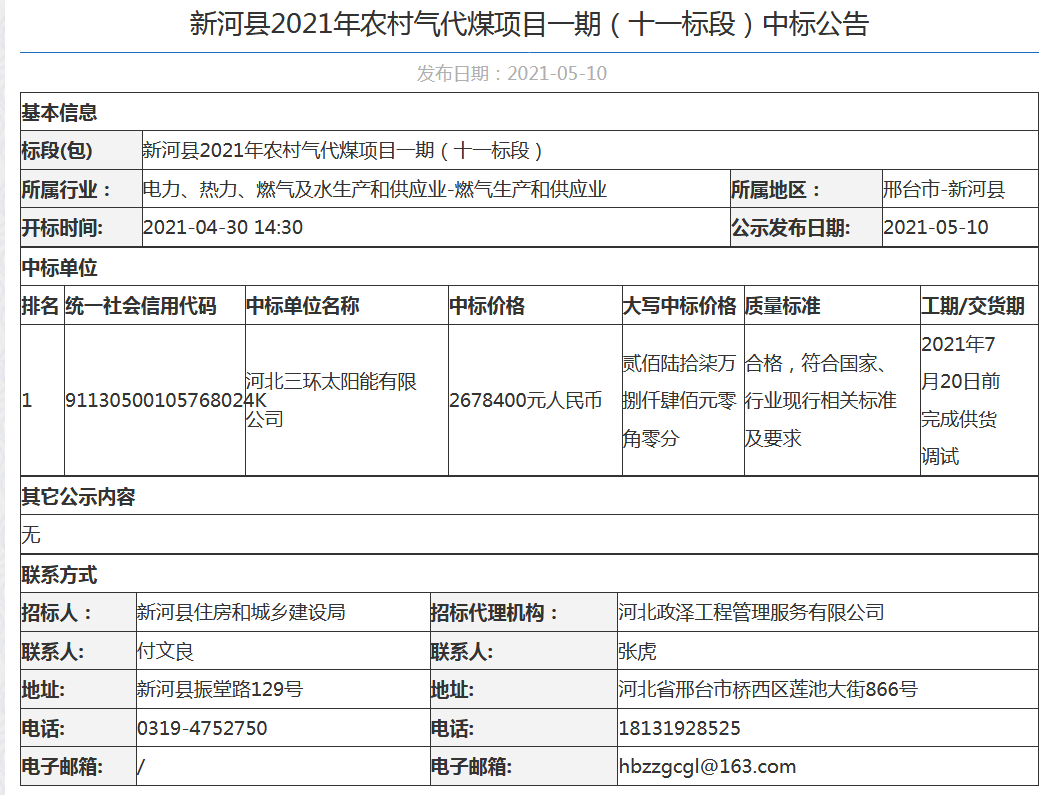 喜訊:我公司中標新河縣2021年農村氣代煤項目